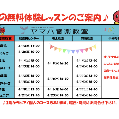 カナリヤ楽器 ヤマハ音楽教室 2026年春の無料体験レッスンのご案内♪